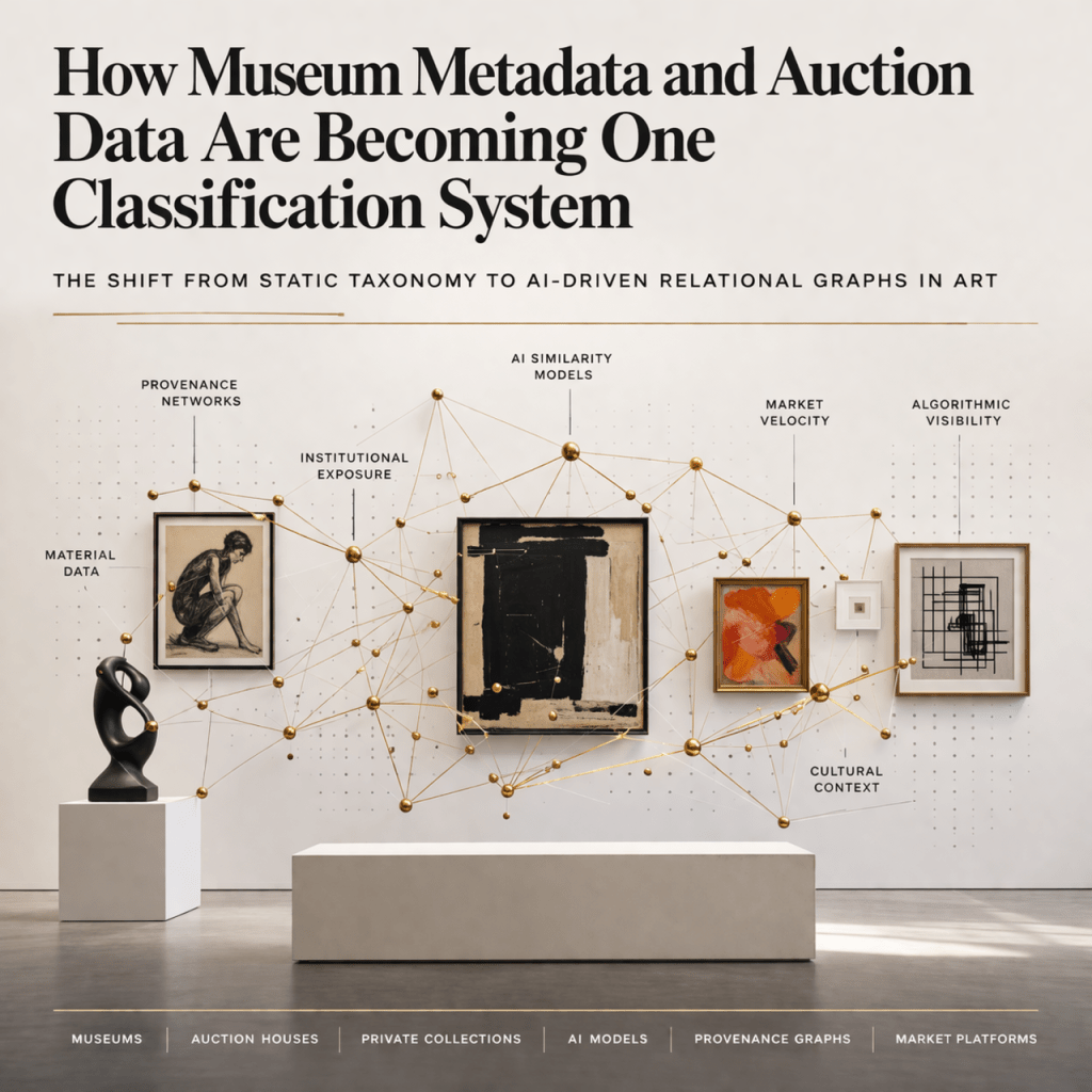 This produces an emergent classification layer that is neither fully institutional nor fully computational, but hybrid. It is already present in some recommendation systems, digital archives, and image recognition models trained on cultural datasets. As these systems expand into museum infrastructure, provenance research tools, and market analytics platforms, their influence on visibility and valuation will intensify.