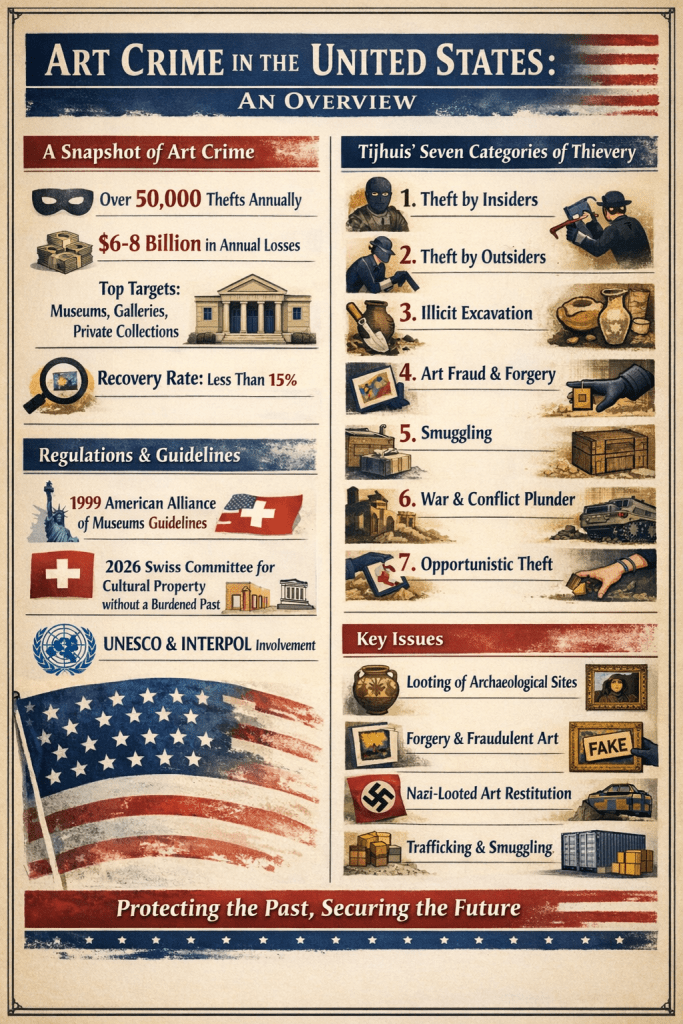 The landscape of art crime in the United States is evolving rapidly, shaped by a combination of historical legacy, organized crime, market pressure, and now technology‑driven interventions. Traditionally, the U.S. has faced theft, forgery, and illicit trafficking across four main vectors: museum and gallery theft, insider theft, private collection theft, and fraud in auction or secondary markets. Notable cases like the 1990 Isabella Stewart Gardner Museum heist in Boston remain touchstones, illustrating how organized networks, insider knowledge, and high‑value targets intersect.