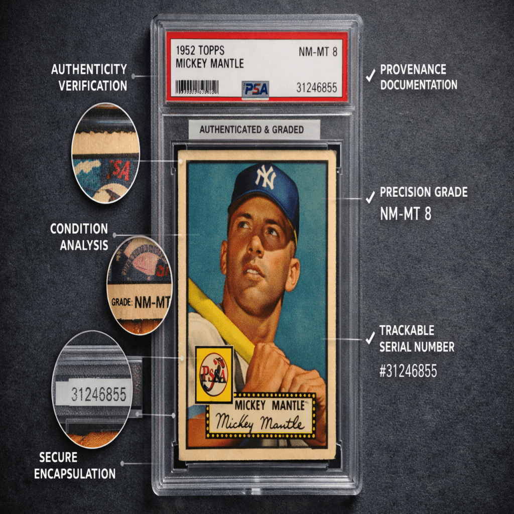 Baseball card authentication is actually one of the clearest analogs to what the art market is struggling with right now: provenance, condition, and trust are all externalized into specialized institutions rather than assumed by the market itself.
